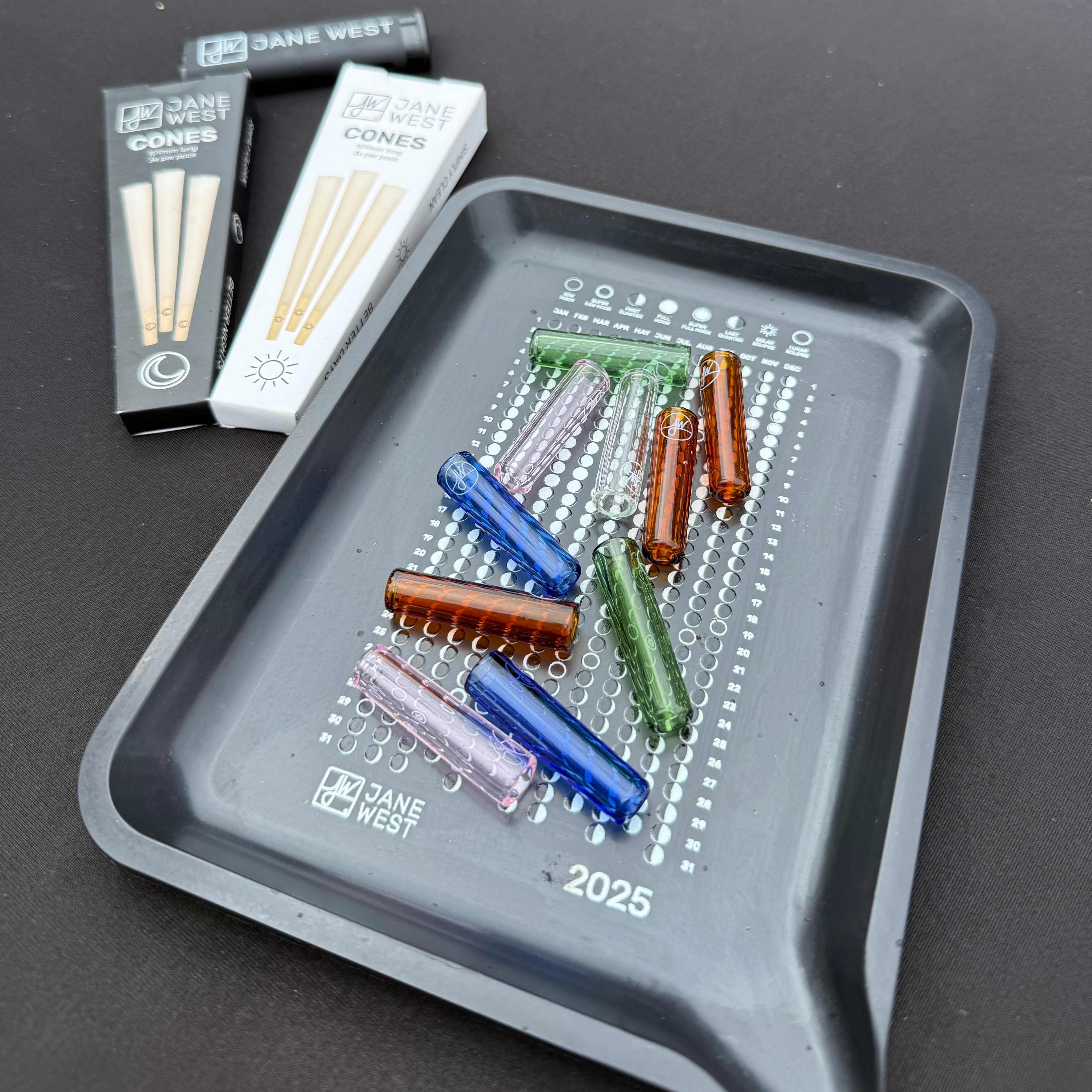 Each box contains 3 x 109mm cones. Each cone has a paper tool inside to help you easily fill the cone, no rolling skills required, just pack, pass and enjoy. Our cones are tested to ensure they are are only the best quality, fine slow-burning European hemp paper. Free from dyes, additives, and chlorine. The filter at the base of the cone features the Jane West logo and a moon icon.