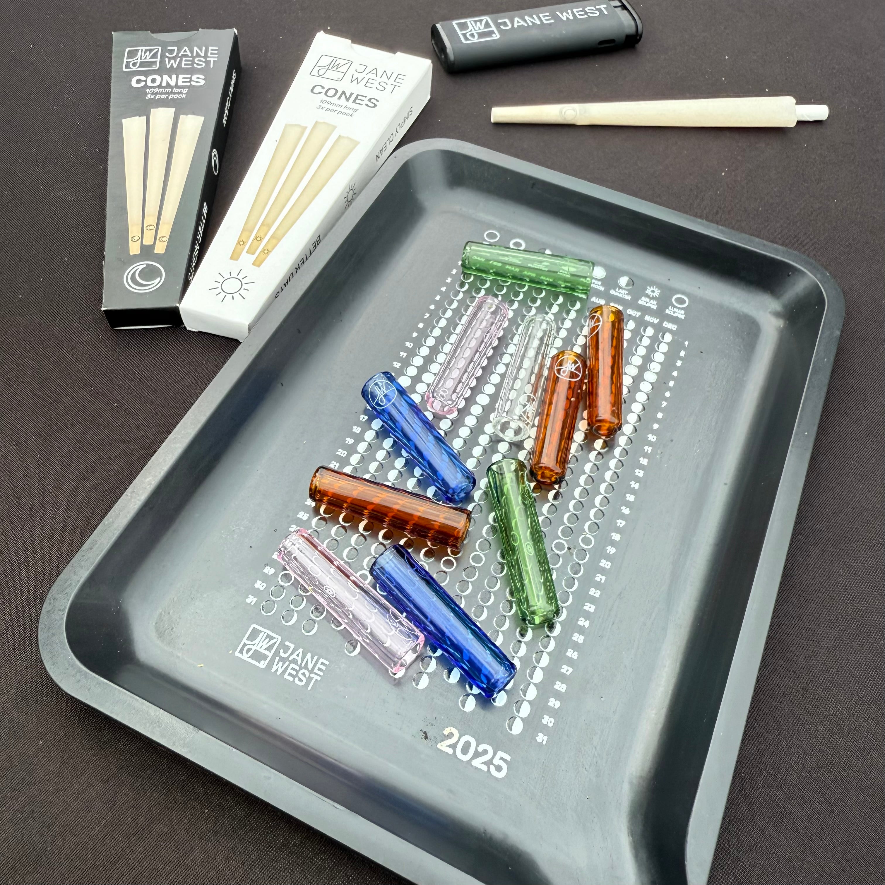 Each box contains 3 x 109mm cones. Each cone has a paper tool inside to help you easily fill the cone, no rolling skills required, just pack, pass and enjoy. Our cones are tested to ensure they are are only the best quality, fine slow-burning European hemp paper. Free from dyes, additives, and chlorine. The filter at the base of the cone features the Jane West logo and a sun icon.